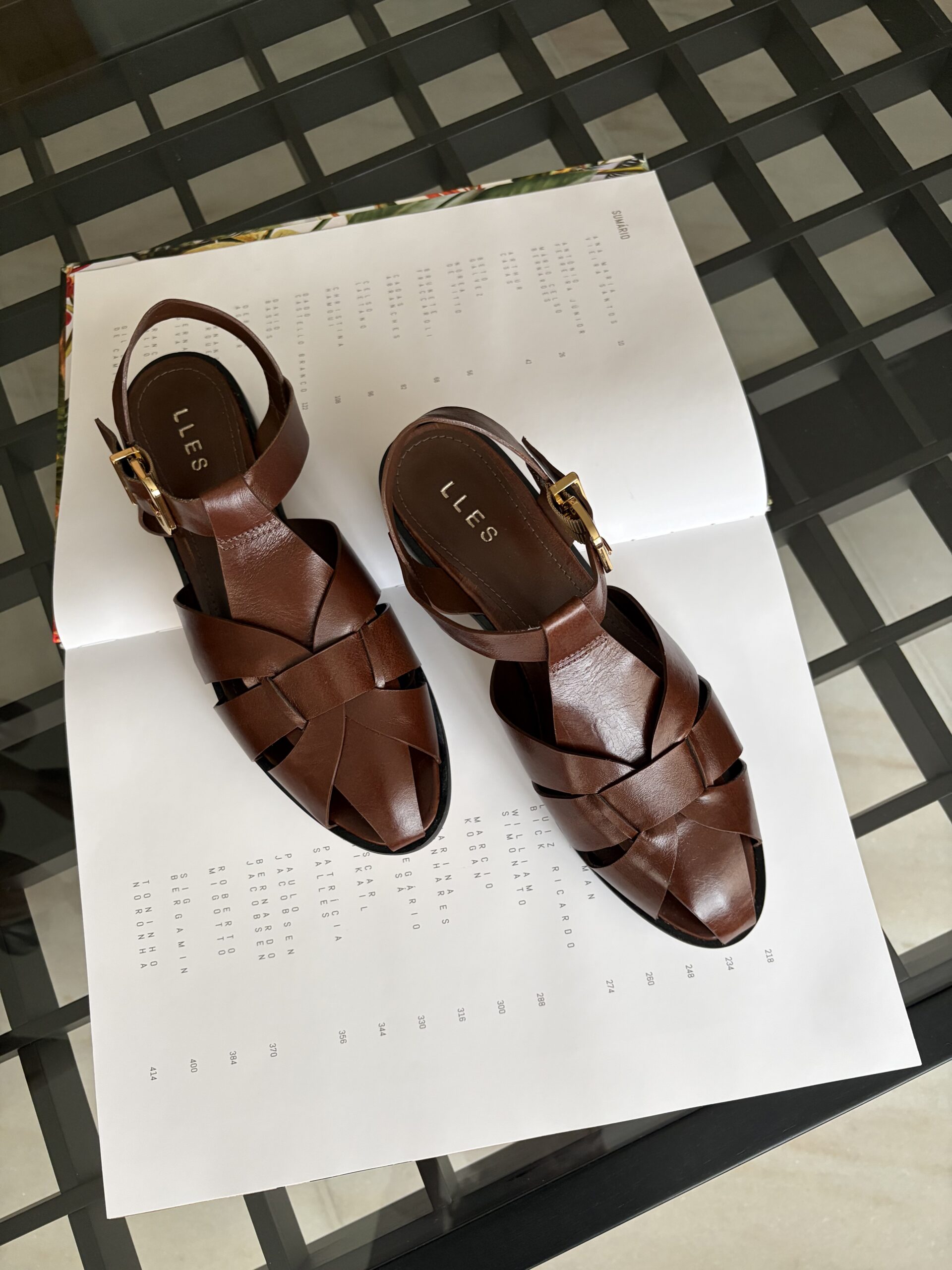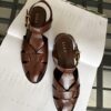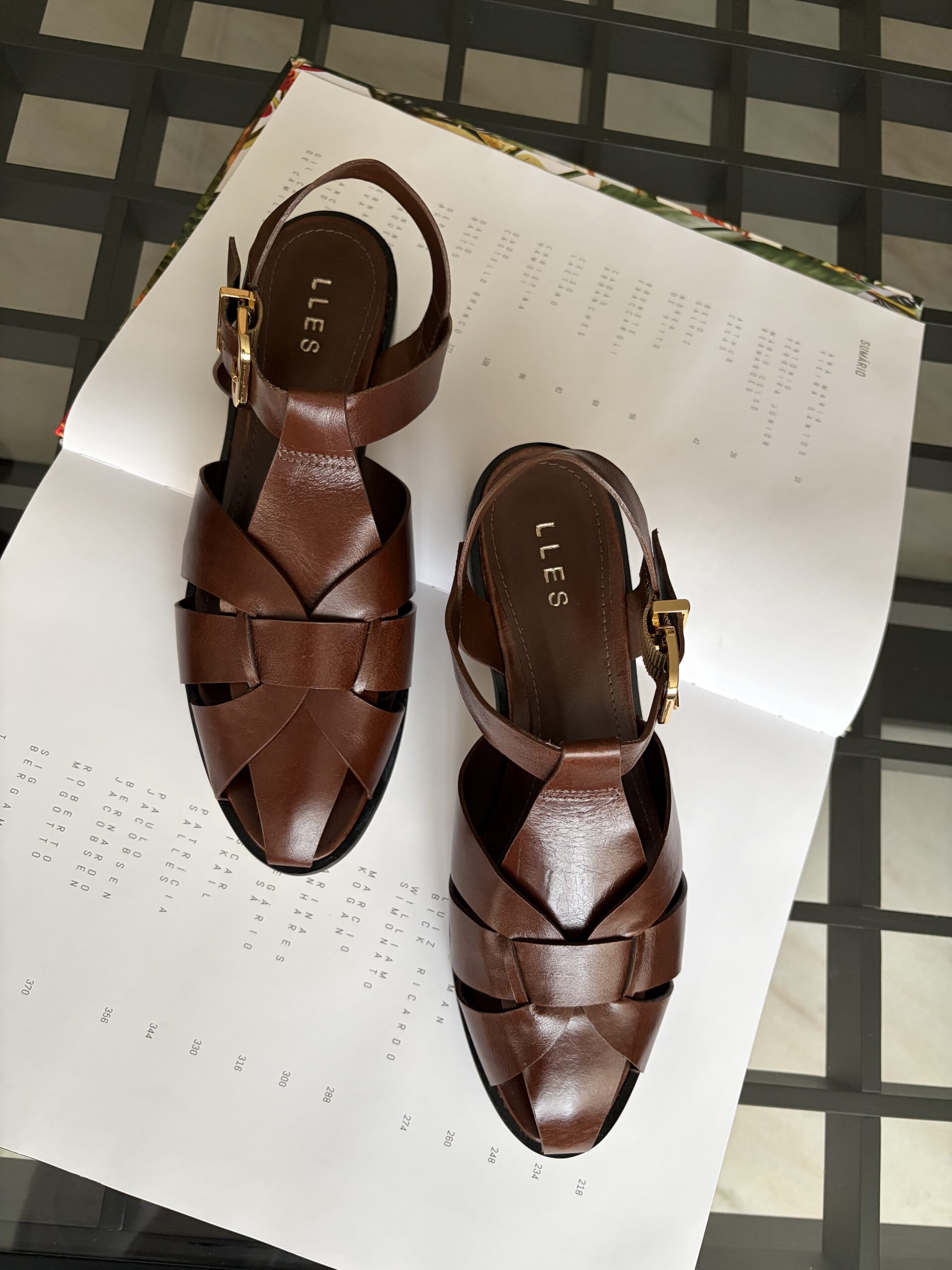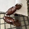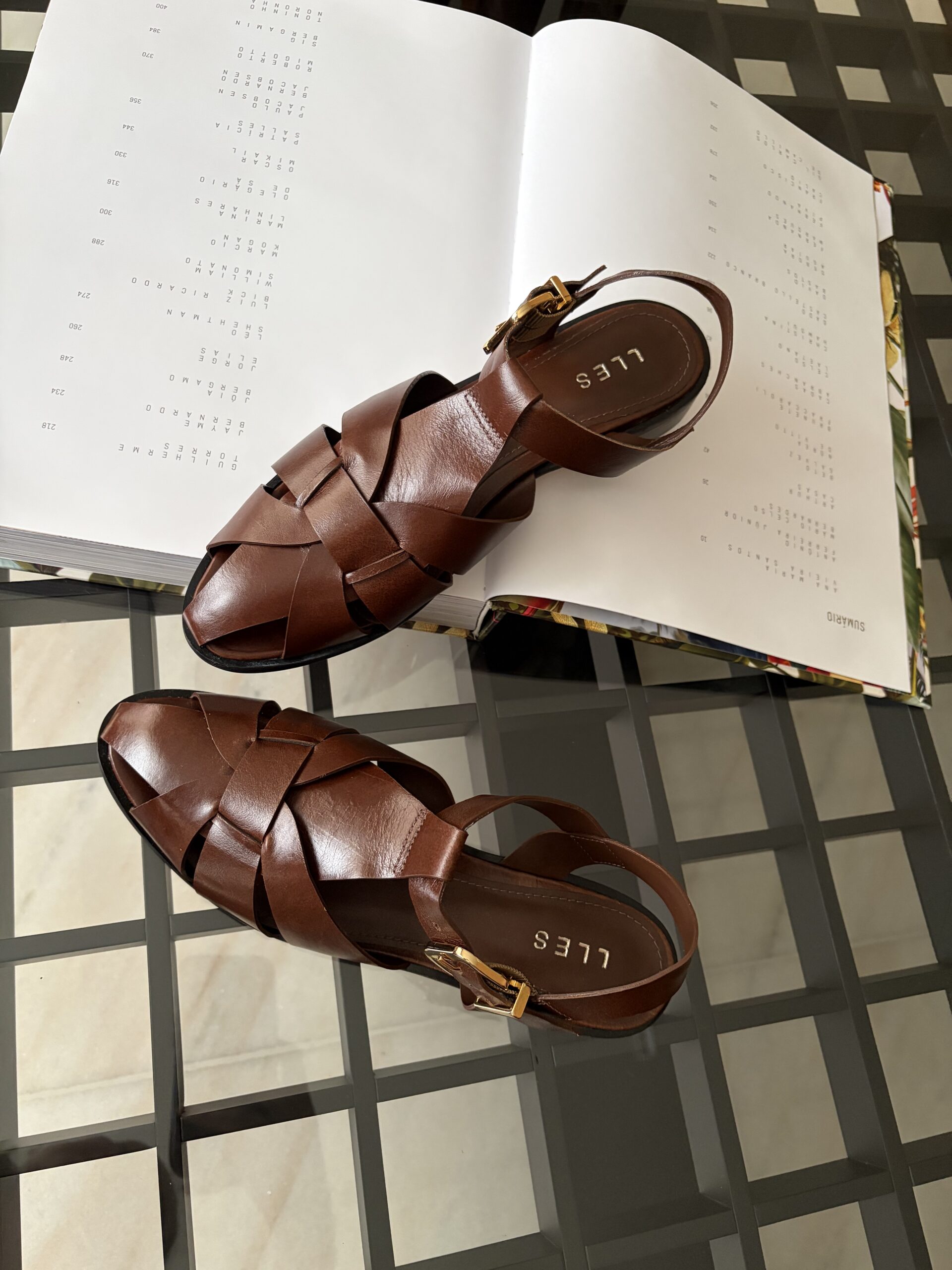 Confeccionada em couro 100% natural na cor marrom, com tiras largas de couro entrelaçadas, criando uma estrutura ventilada e elegante. O fechamento é feito por uma fivela dourada, garantindo o ajuste perfeito.